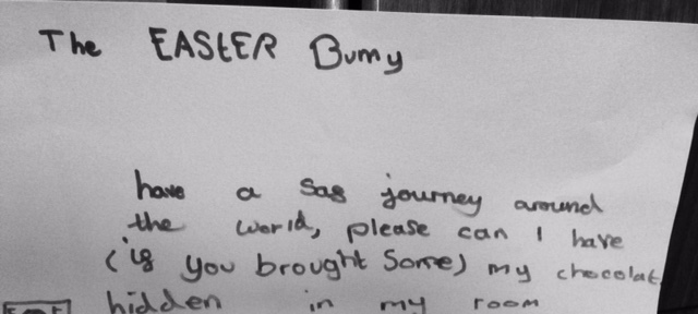 This writing to magical, legendary creatures started some years ago, when Archie lost his first tooth and came home from school declaring that one of his school friends had written a letter to the Tooth Fairy and she had replied and left fairy dust and footprints in it. He was spellbound! “Can I write to the Tooth Fairy, Mummy?” he pleaded. There are so many advantages of living where we live – in a gorgeous part of the country with super people – but sometimes, some of them just go a bit too far and raise the bar a bit too high. I mean, come on people!!! Footprints and fairy dust!? I had little choice but to join in and now both my children write to their own Tooth Fairies – Blossom (Archie’s) and Apple-Finch (Martha’s), who have their own back-stories and family dramas going on…..honestly, I have surpassed myself with the amount of fantastical bullshit I am able to conjure up in my replies to their regular letters. And, it would now appear we have progressed to writing letters to the Easter Bunny too. I have, it would seem, raised my own bloody bar and have no one to blame but myself.
